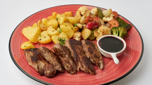 Acompañado de verduras y papas salteadas, y una salsa a elegir (champiñones / vino tinto / pimienta verde).