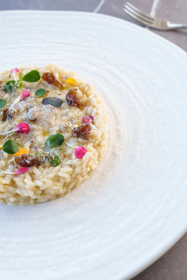 - Risotto carnaroli, mantecato con tuma persa, fichi caramellati, essenza al bergamotto e polvere di ostrica