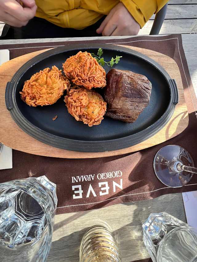 - Filet de bœuf 200g, sauce poivre & beignets de pommes de terre