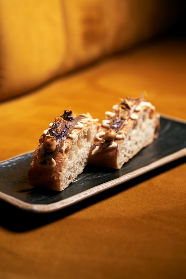 Anchoa del cantábrico 00 con mantequilla de oveja y coca de folgueroles.