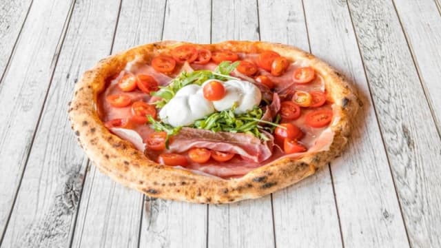Focaccia, rucola, pomodorini, treccia di bufala, crudo di parma