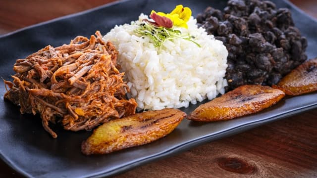 Riso basmati, carne di manzo sfilacciata, fagioli neri e platano fritto