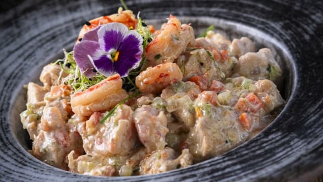 Pesce e gamberi marinati nel latte di tigre aromatico, peperone verde e rosso, peperoncino rossa, cipolla rossa, coriandolo. Servito con tostones