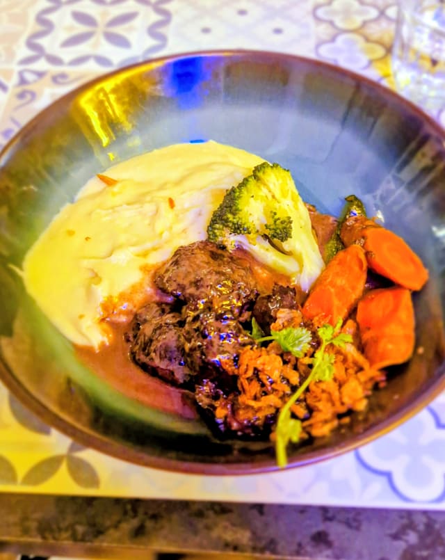 Bochechas de porco preto com puré de batata trufado