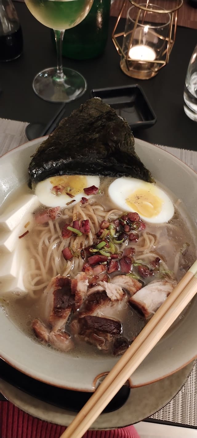 Carne di maiale, uova, wakame disitratato, porro e noodles.