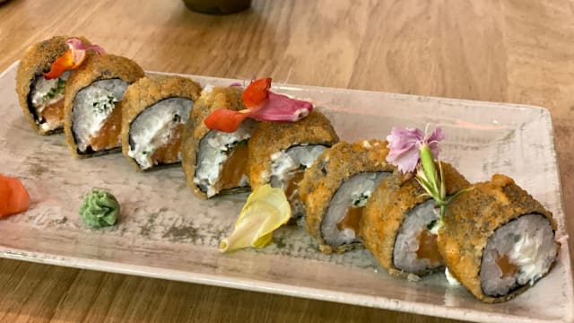Langostino furai, salmón, queso crema y ciboulette, envuelto en nori tempurizado.