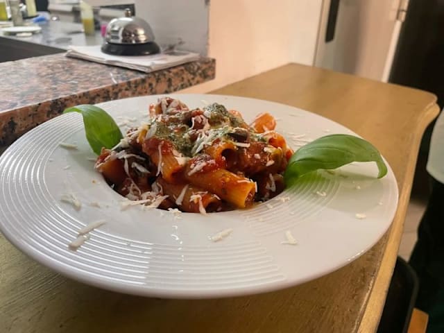 Tortiglioni con melanzane, pomodoro, crema di basilico, ricotta salata.
