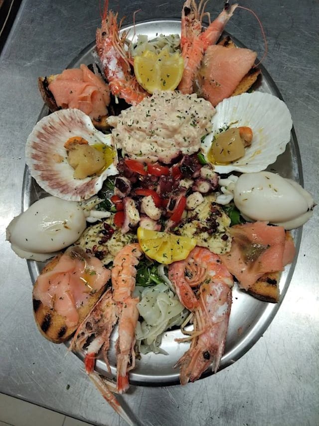 Gamberetti in salsa rosa, canestrelli gratinati, seppie in nero su polenta morbida, polpo rosticciato su crema di patate e pomodorini confit, crostino con salmone affumicato e crostino con baccalà mantecato (produzione propria)