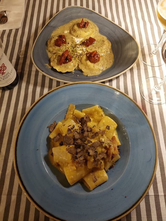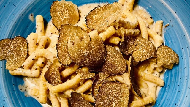 Cappellacci verdi ripieni di salsiccia, cipolla caramellata e patate. Serviti su crema di zucca vellutata, arricchiti da una pioggia di formaggio di fossa e croccanti noci. Un incontro tra morbidezza, sapidità e dolcezza che celebra i sapori d’autunno