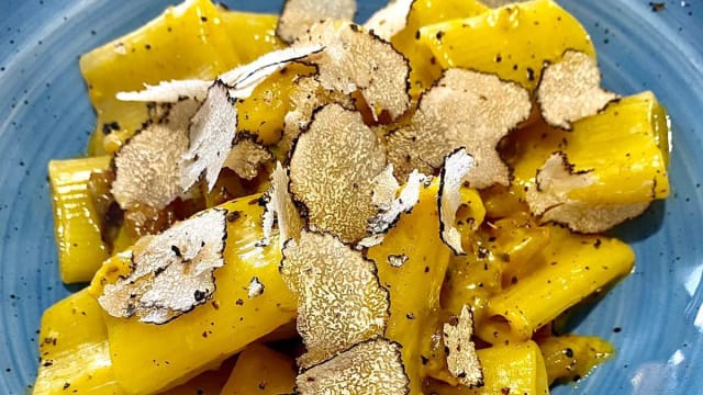 La ricetta classica dei paccheri alla carbonara fatti rigorosamente con guanciale norcino. Il tutto ricoperto da una pioggia di tartufo nero