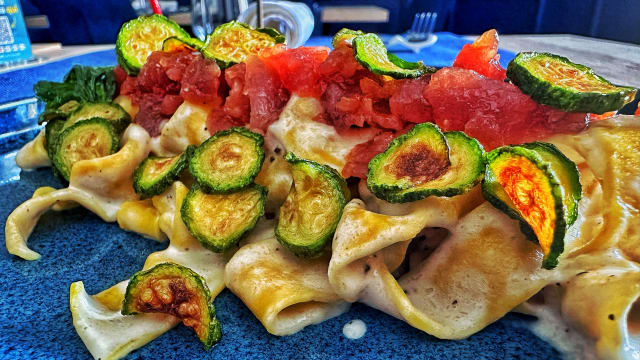 Scialatielli con ragù di gallinella di mare e dressing al basilico