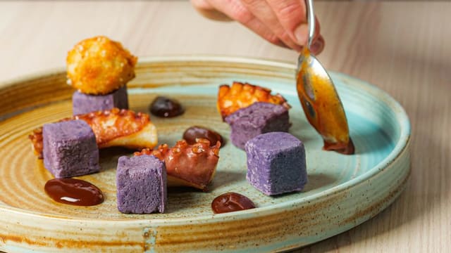 Calamaro alla brace con crema di pomodoro alla mediterranea, polvere di olive