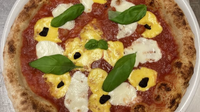 Fonduta di parmigiano e cipolla rossa di cannara / lardo agli aromi e miele locale / pomodorino e basilico / tartufo nero e porcini / ciauscolo / olio EVO