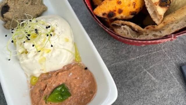 - Crema tartufata, provola fumé, champignons bruns, lamelles de truffe, choux rouge, 1/2 burrata à la truffe, crème balsamique, germes de betterave