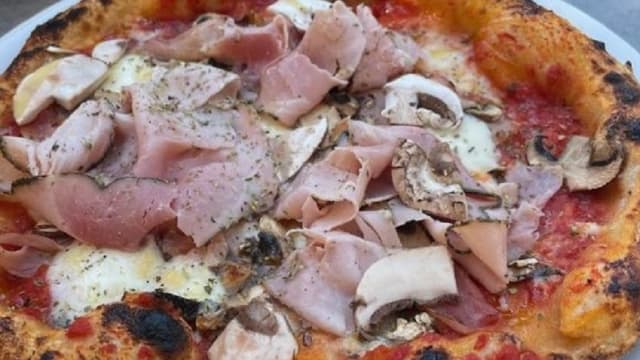 - Sauce tomate fraîche de carlo manzella, provola fumé, lamelles de champignons bruns, jambon aux herbes rovagnati, germes de petit pois, origano siciliano