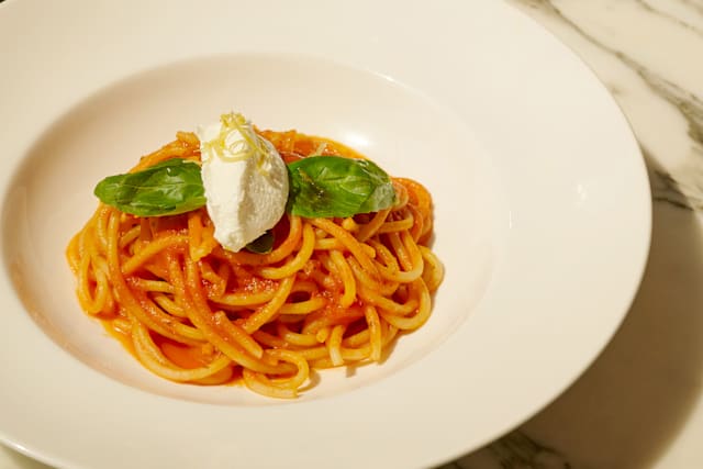 Spaghettoni di gragnano igp con salsa di pomodoro, caprino e scorza di limone grattugiata
