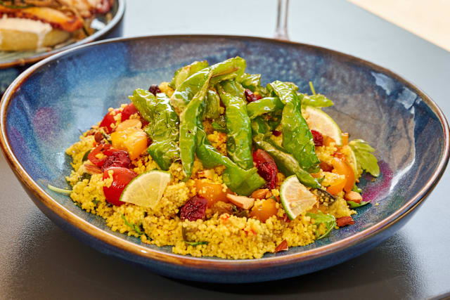 Cous cous con verdure di stagione, rucola, mandorle tostate, uva passa, mirtilli rossi essiccati, menta e lime