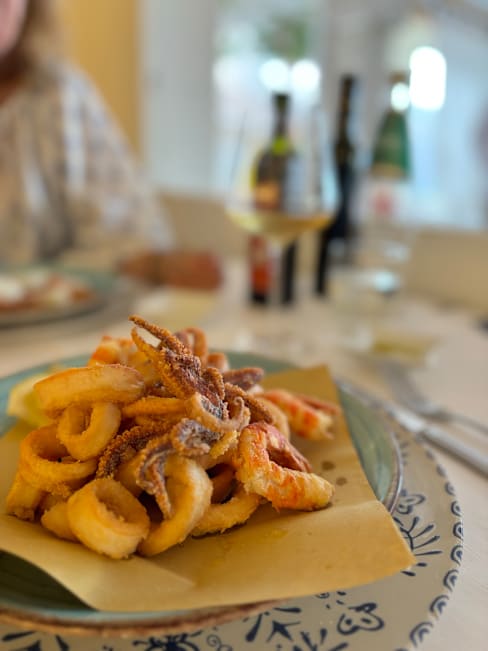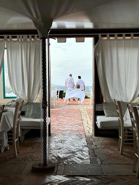 8.5/10We dined as a couple at Il Baretto (“the little bar” in inglese), Porto Rotondo, Sardinia, on a Friday evening in late June. We arrived on time for our 7:00 PM (1900 ora) reservation and had our choice of tables on a piazzeta overlooking the Porto Rotondo yacht basin. The view of the yacht basin and of the nearby open sea was delightful. For our meal, we chose insalata mixte, Baretto’s version of pasta carbonara (oversized rigatoni noodles and peppery pancetta - yum!), frittura di calamari e gamberi (squid and small prawns, locally sourced), and sparkling wine by the glass. Our dessert choice, fresh mango slices in a delicate sauce with pastry crumbles), was especially memorable. To walk to Il Baretto, pay careful attention to the Google Maps App on your phone. It is located on the Piazza Rudalza but there is no directive signage on nearby streets and alleys. Il Baretto shares floor space on the piazzeta with another restaurant, Deste. A third ristorante, Paramare, is situated below.