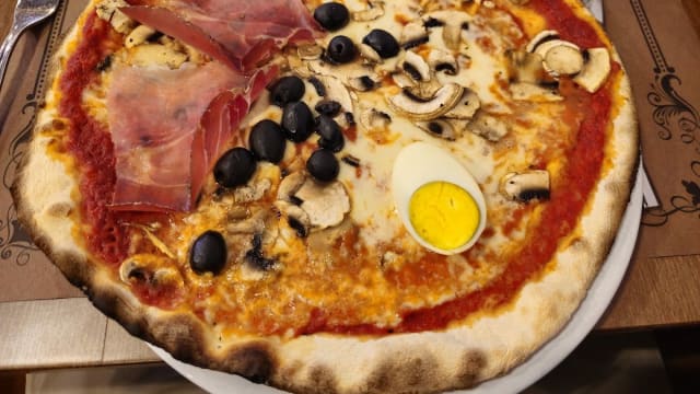 Tomato, ham, mozzarella, egg, mushrooms