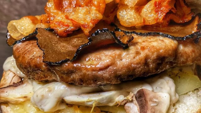 Hamburger di vitello da 200 gr., pecorino stagionato, funghi, tartufo fresco, barbazza croccante e salsa boscaiola