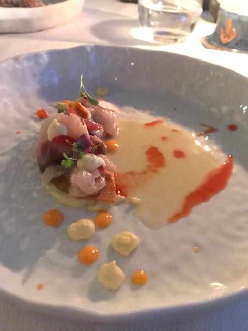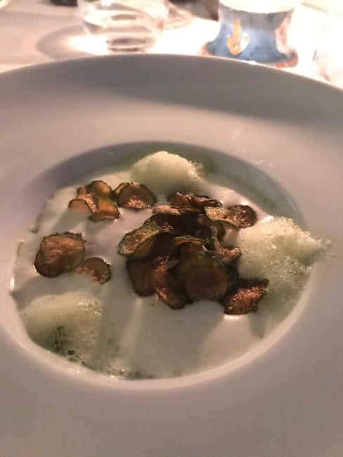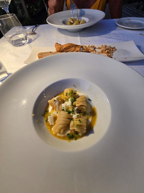 7/10+1The location was lovely, great views with a fantastic sunset. The staff very attentive and professional. However the food was disappointing. Courses started well, with a lovely tasty starter, but then two pasta dishes much the same, the food just lacked verity and inspiration. The last dish was a sorbet which we could not eat, as it was so bitter, on telling the waiter it was replaced very quickly with a nice ice cream. At the end of the meal we where given a sizable slice of Panettone which the chef had made with fine chocolate and apricot, this was delicious. At the end of the meal we were given a bottle of lemon chello as a gift, a lovely gesture. The wine list was extensive but many wines were reasonable priced. When we book the restaurant did contact us to say they had a disco that night, we tried to rearrange the date but could not so we kept our booking. However the music was very loud at times. Maybe a fine dinning restaurant need to make up its mind what it wants to be.