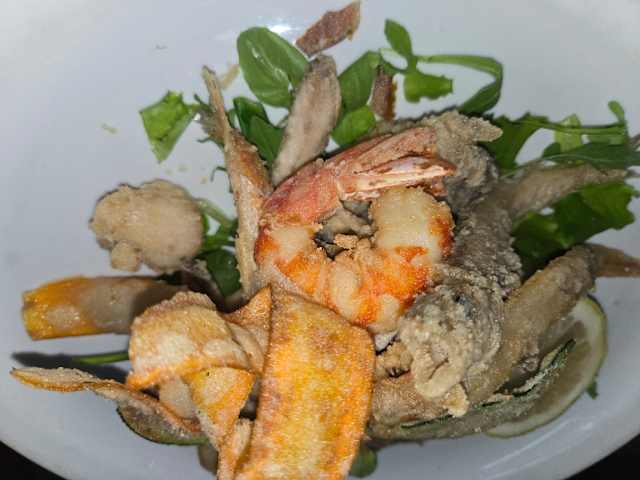 Fritto misto di alma su insalatina di cavolo viola e dressing allo yogurth di soia