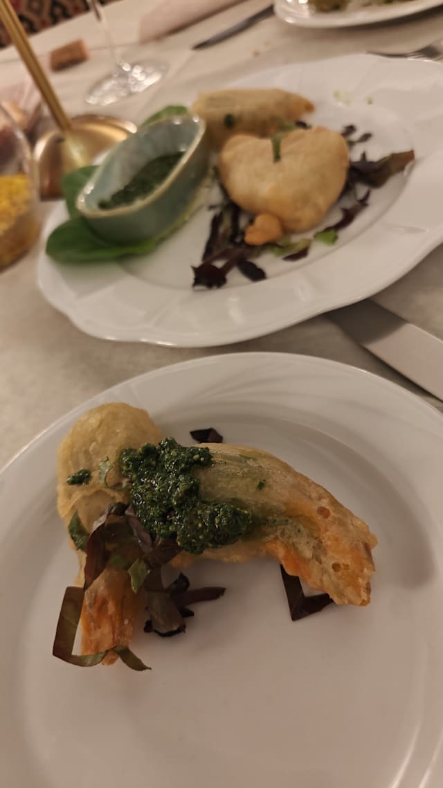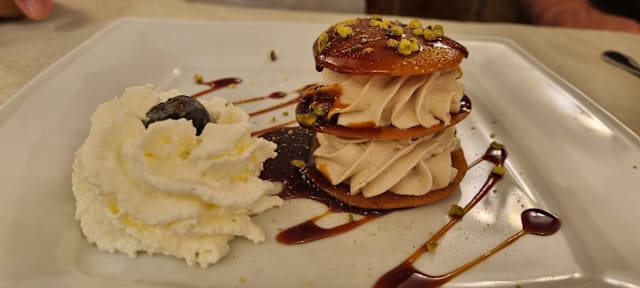 Crespella alla valdostana gratinata al forno con fonduta di fontina D.O.P., prosciutto cotto e noci
