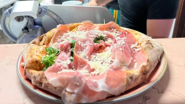 Pomodoro, mozzarella fiordilatte, rucola, prosciutto crudo di parma, scaglie di grana padano