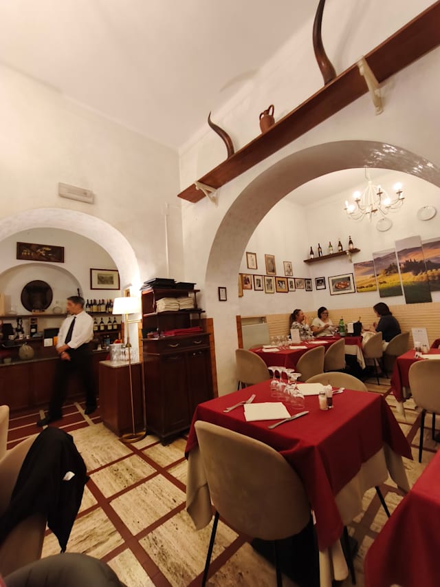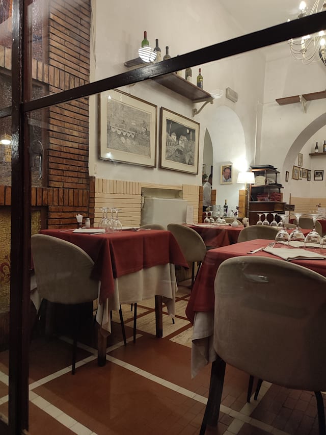 6.5/10Food was not good. We ordered the carbonara as a starter: pasta was slightly overcooked, eggs were raw (not creamy) and bacon was completely burned. This dish is a must in Roma and if you fail it, you should really make a step back. As a main, we had an ossobuco, which was not tasty because the quality of the main products was scarse. However, the meat was cooked well. The spinach as a side, were quite untasty and the olive oil should be definitely better. The Falanghina, as vino della casa was cheap but relatively drinkable.