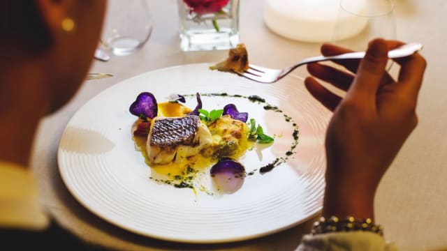 Pesce azzurro con pera e pecorino, crema di topinambur e gel al greco di tufo