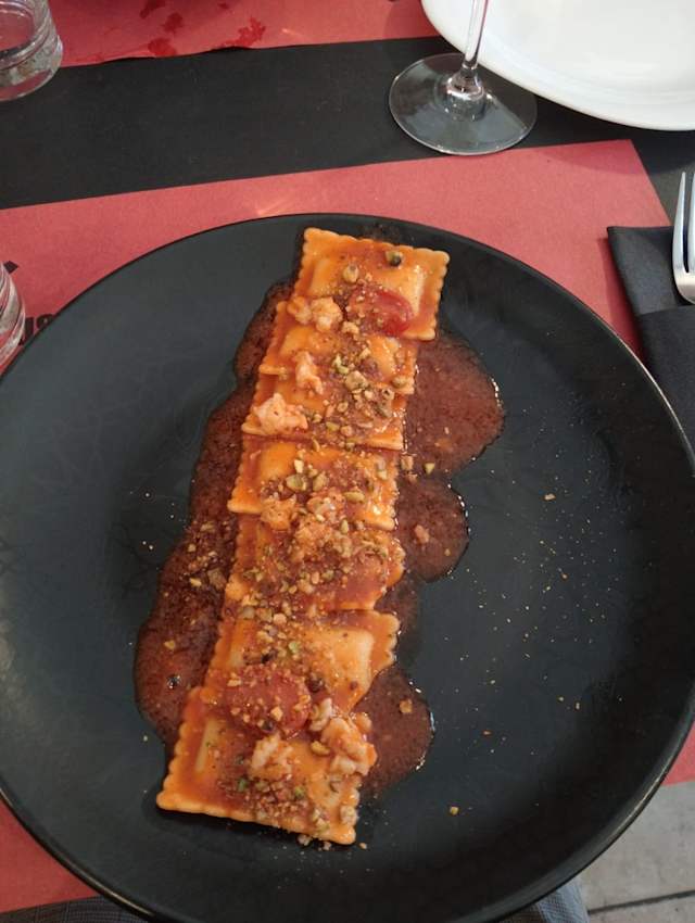 - Ravioli di mare di andre ripieni con scampi, ciliegini e pistacchi