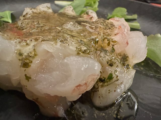 Tartare di gamberoni con vinagrette fatta di olio, limone e erbe aromatiche