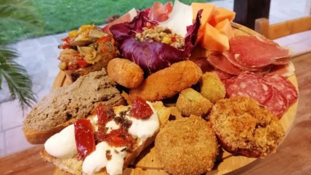 Salumi locali, bruschette, verdure fresche pastellate e stuzzicherie