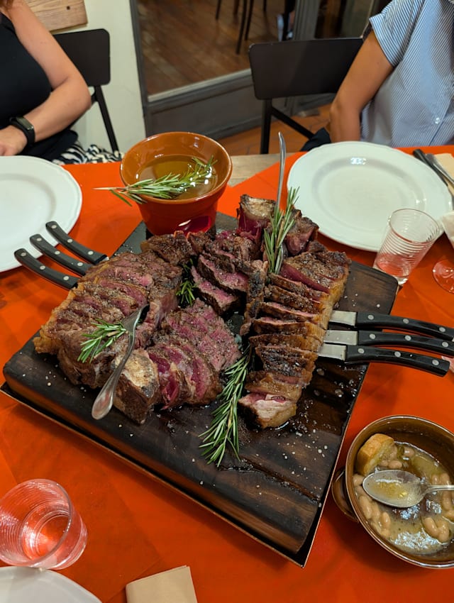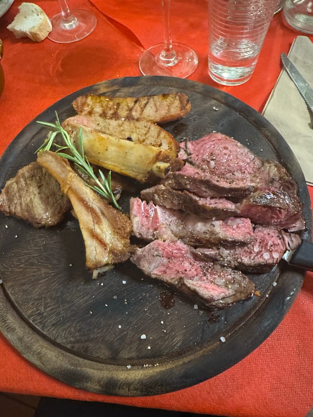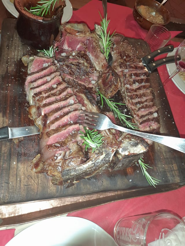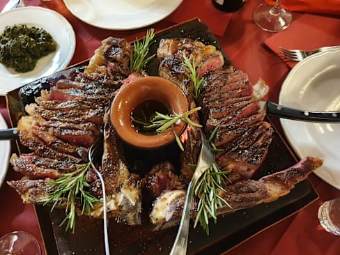9/10This place reveres meat, and Bistecca Fiorentina in particular. Unfortunately, there was only one waitperson on duty, but she did an amazing job. She had to do service, plate clearance, course changes, coffees and wine orders, and we saw her also cutting up the very large joints for service as slices as well. A true heroine of the dish, was her skill in combining these tasks and getting everything out, if not on time, then in a very consumable sequence. And the Bistecca was just divine. Very limited vegetarian options.