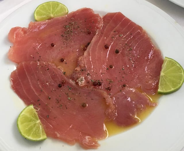 Carpaccio di tonno tagliato al coltello marinato al lime, olio EVO, origano e pepe rosa
