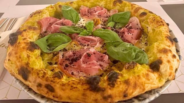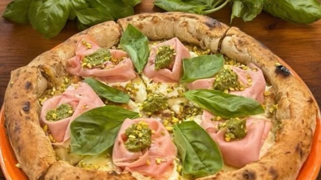 Pesto di pistacchio, mozzarella, prosciutto crudo 24m, chips di patate viola, granella di pistacchio, burrata, cornicione granellato di pistacchio