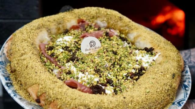 Mozzarella fior di latte, pesto di pistacchio, porchetta di ariccia, ciliegino giallo, stracciatella al pistacchio, bordo coperto di granella di pistacchio