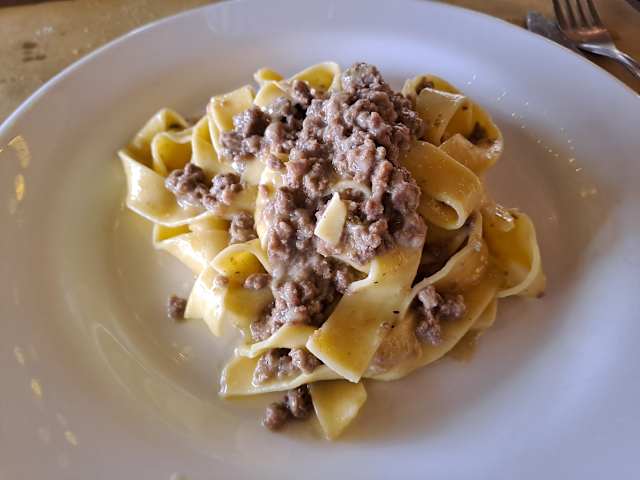 - Pasta fatta in casa con guanciale di maiale nero cinghiato, pepe e pecorino di Norcia