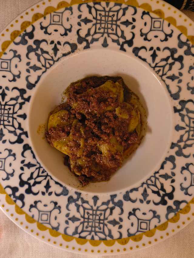 - Tortello ripieno di patate con ragù di faraona e granella di nocciole