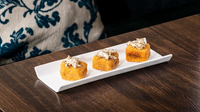 Milanese di vitello ripiena di jamón ibérico e queso manchego, uovo morbido e tartufo nero estivo