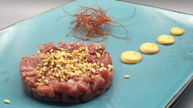 Tartare di tonno con crema di burrata e chips di riso soffiato.
