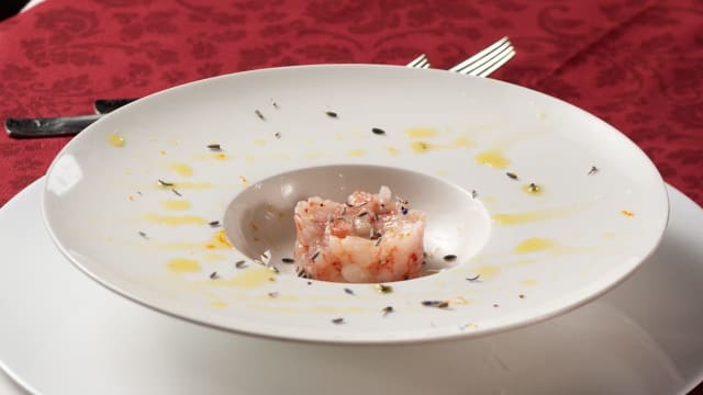 Con gamberoni flambati, pomodorini confit e crumble di tarallo pugliese