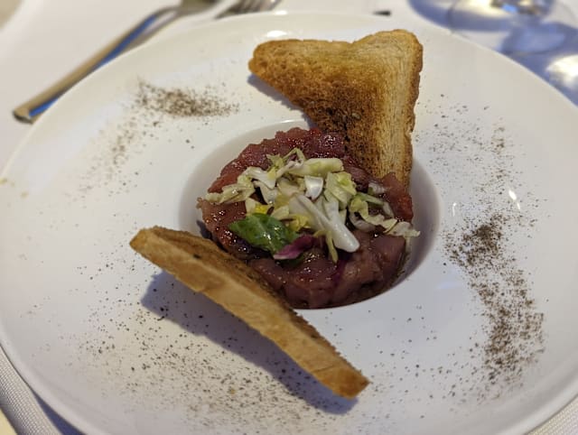 9.5/10Truly delicious food. The tuna tartare was superb and the melanzane light and delicious. Ravioli alla gamberi was perfectly cooked and the sauce was very, vert tasty. Swordfish roulade was excellent and different.