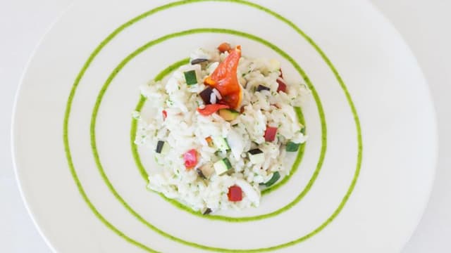 - Crema di melanzane e basilico confit, melanzana croccante, pomodoro e ricotta Salata affumicata