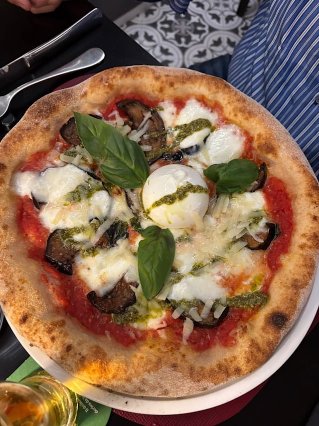 Pomodoro san marzano DOP, fiordilatte campana in acqua DOP, melanzane fritte, pesto di basilico, bocconcino di burrata al centro