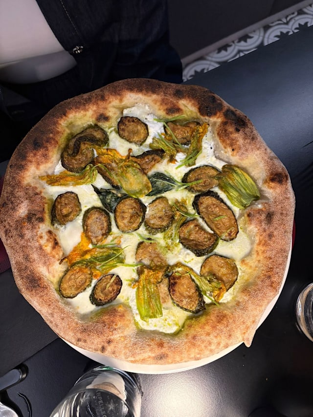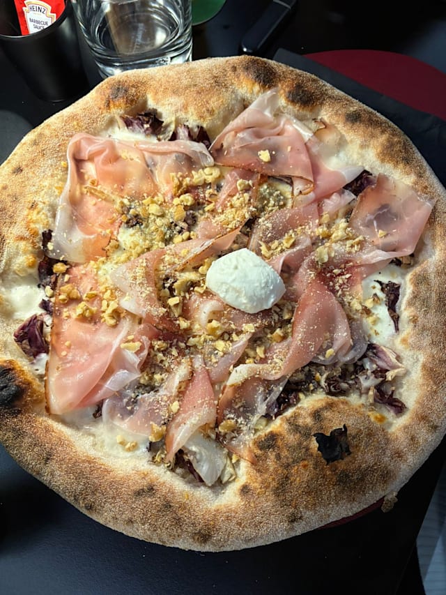 Pomodoro san marzano DOP, fiordilatte campana in acqua DOP, carciofi alla brace, prosciutto cotto alta qualità, funghi spadellati, olive taggiasche, basilico, olio EVO