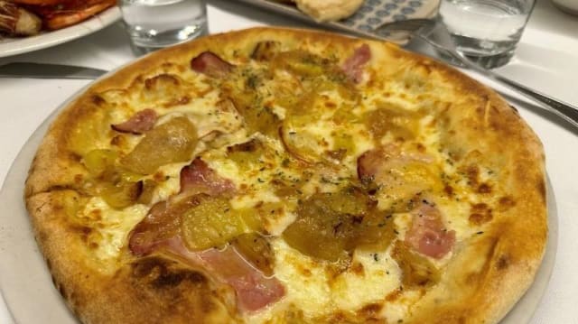Mozzarella, bacon, patate al forno, provola affumicata, cipolla, scaglie di grana, origano e rosmarino.