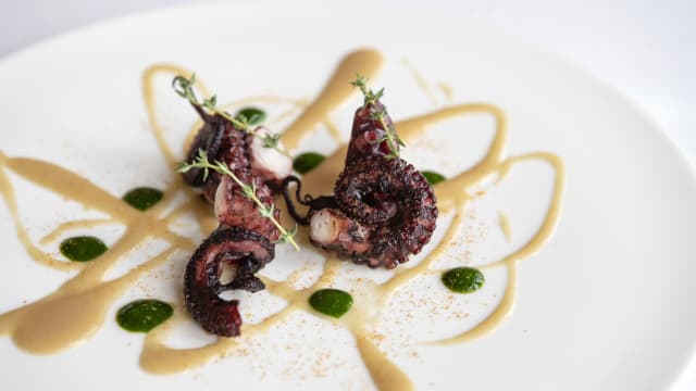 Polpo alla brace con pesto di melanzane affumicate in zuppetta di burrata e colatura di alici