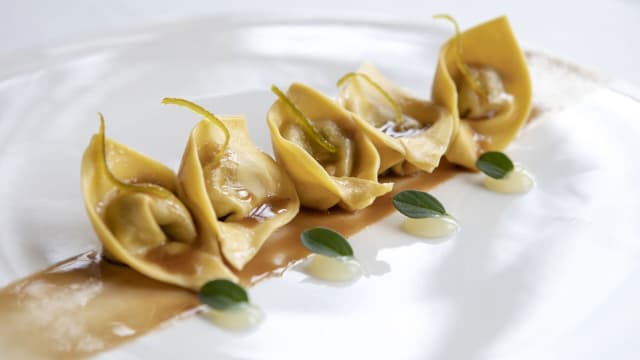 Raviolo aperto alle capesante in salsa di corbarino e limone del garda