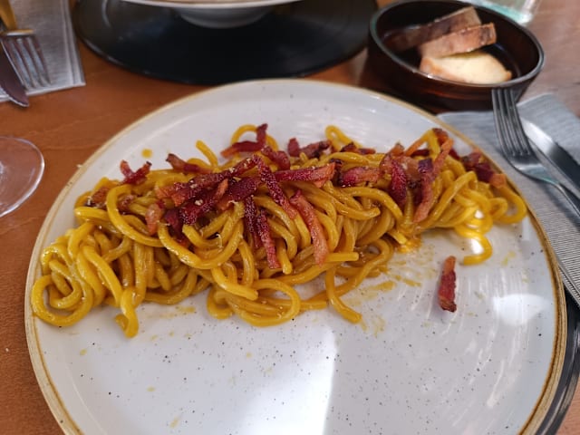 9/10+1This is a neighbourhood bistro with a very good menu. There were 4 other tables on a Thursday evening all served by the owner who was very welcoming and laid back We were given an amuse bouche of tapenade which was good and delicious breads. We ordered a bottle of Vermentino which was superb and very good value My partner ordered the squid to start and said it was very good. I had spaghetti with clams and lemon which was very tasty. To follow I had monkfish wrapped in bacon with carrot top purée. The fish was perfectly cooked and my partner had breaded salt cod with puffed rice in the coating which was delicious. We followed with a cheesecake to share which was nice and a bronze grappa which was very smooth